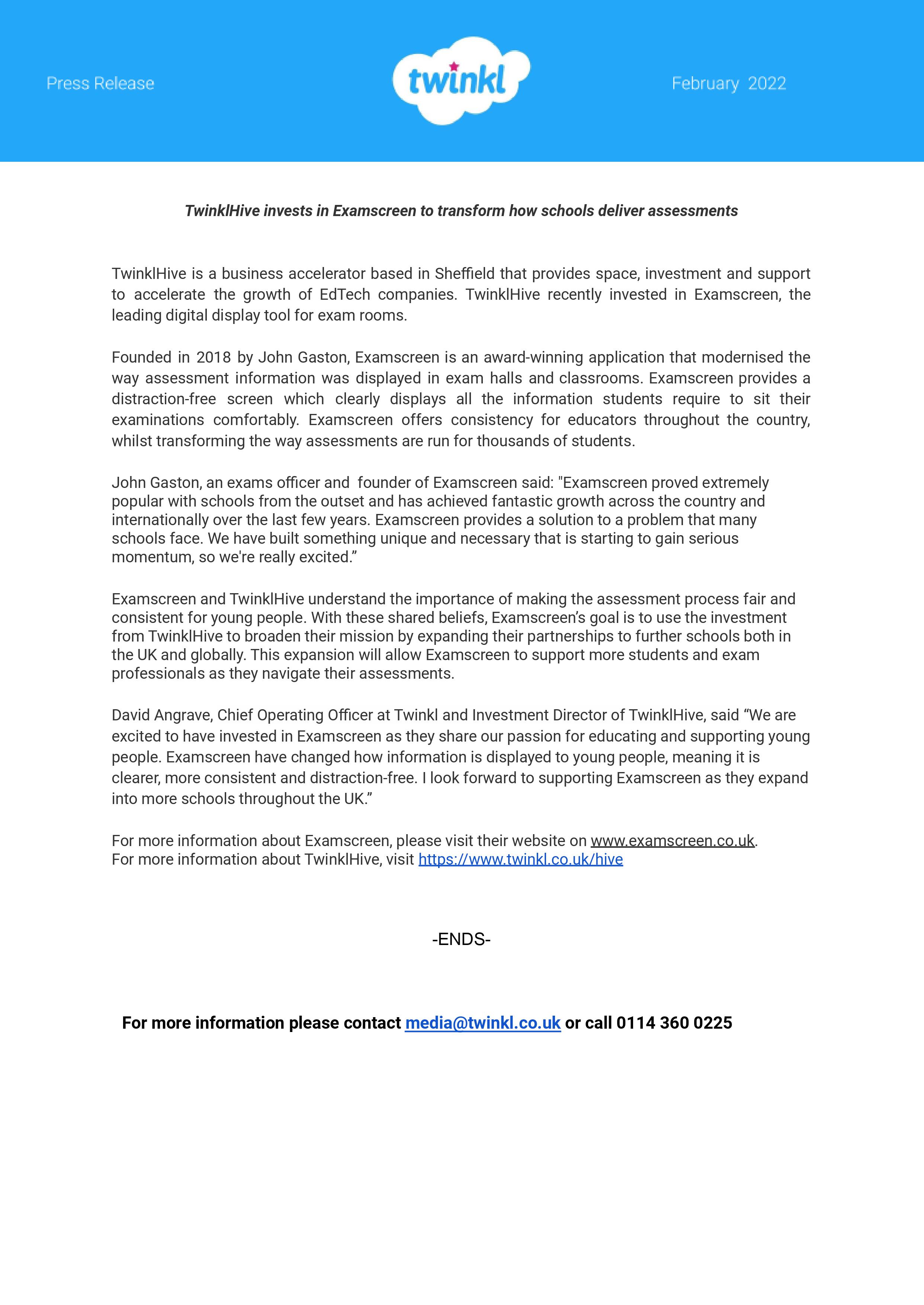 In February 2022 Examscreen joined forces with Twinkl Publishing Group, one of the world's leading providers of educational resources. The partnership will enable John and Sophie to support more students and exam professionals and promote Examscreen and Twinkl's joint goal of making the assessment process as fair and consistent as possible for young people